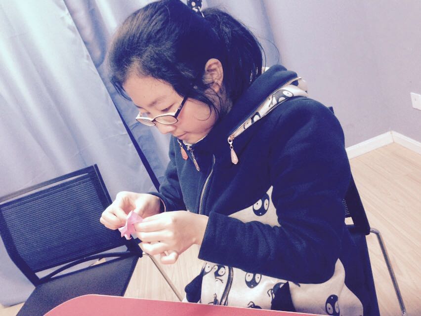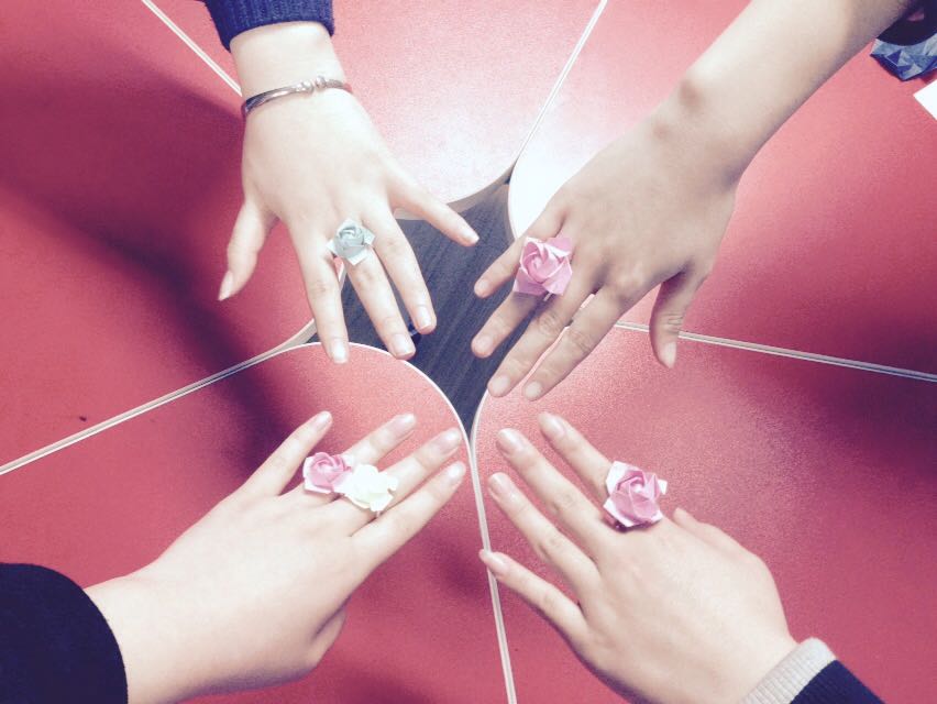 女孩生来爱美。在成功折出猫头鹰后,小组成员又开始了对玫瑰花戒指折纸的钻研。要折出小巧玲珑适合手指大小的玫瑰,难度自是大大增加,只恨手指不能变小了去对付那张小方纸。眉头时而深深皱起,但在寻到窍门不一会后又放松下来,最后一根纸绳穿过玫瑰,往手上一套,真叫是美的别致。