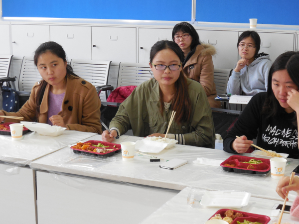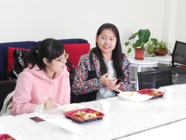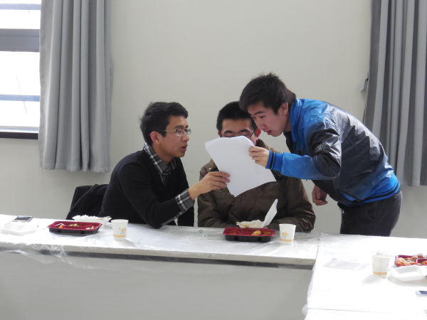 午餐会开始,其乐融融,苏晓佳同学首先介绍了创意工作室布局设计布置方案。首先是红色时钟的周边,想采用“海上日出”这个图案进行装饰,寓意是希望,用蓝色波纹贴纸加上海鸥,云朵贴纸生动点缀。然后又谈到用黑盒子摆出team的造型来装饰门正对着的柜子、改变垃圾桶的位置、用挂画装饰开关以及办公室的小柜子的装饰。苏晓佳同学思路清晰,条理清楚,同学频频点头赞同,老师们认真听取了同学们富有建设性的意见。
