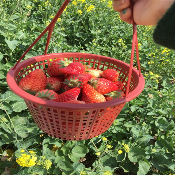 老板姓沈,是一位可爱的大叔,为人热情大方,给我们每个人分发了一个酒红色的篮子,指着不远处有着六个大棚的草莓田,豪爽地道“你们尽情摘吧!”这可乐坏了我们这群“馋鬼”们。大家迫不及待的三三两两,组队奔向棚里。采摘过程中不时传来吵闹声:“喂!你干嘛抢我的草莓?”原来是蓝世华同学恶作剧,抢走了赵春蓉篮子里的草莓,被揪着不放……真可谓热闹非凡。大概十一点的时候,大家纷纷提着自己采摘的草莓去称重。