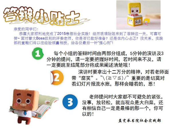 为期两天的答辩活动中,实践小组们分享了自己的实践故事,团建中心社会实践部也做出了自己的创新,向每支实践队伍发放答辩小贴士以缓解大家在等待答辩时的紧张情绪,鼓励大家能发挥出自己最佳的一面。