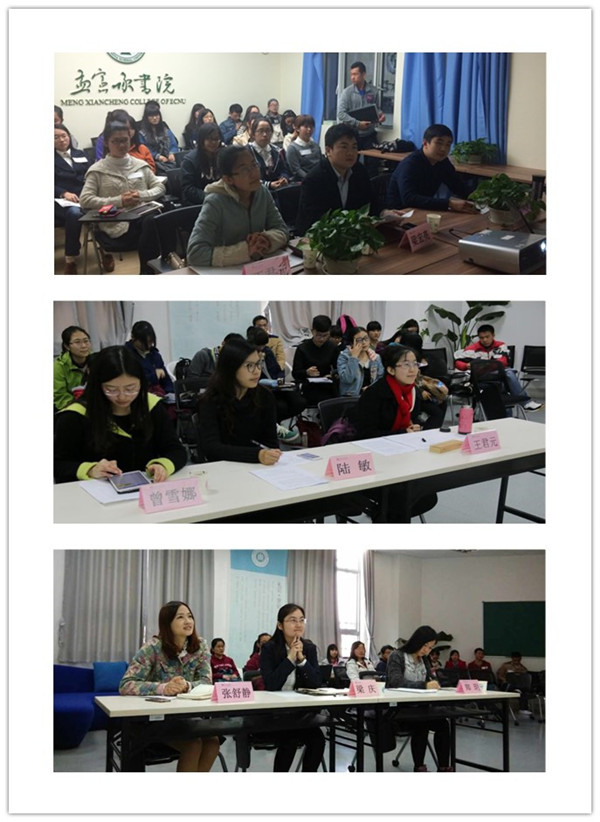 本次寒假社会实践答辩评审团成员包括:孟宪承书院学工组长兼团委书记、团建中心指导老师梁宏亮、党建中心指导老师梁庆、职业生涯发展中心指导老师陆敏、团建中心主管张舒静、团建中心副主管王君元、团建中心副主管郑玥、职业生涯发展中心生涯实践部部长曾雪娜、团建中心社会实践部部长林健宇。每支队伍在五分钟内进行汇报,汇报结束后评委老师们都恳切地进行点评并提出对参赛队伍的种种极富价值的参考建议。