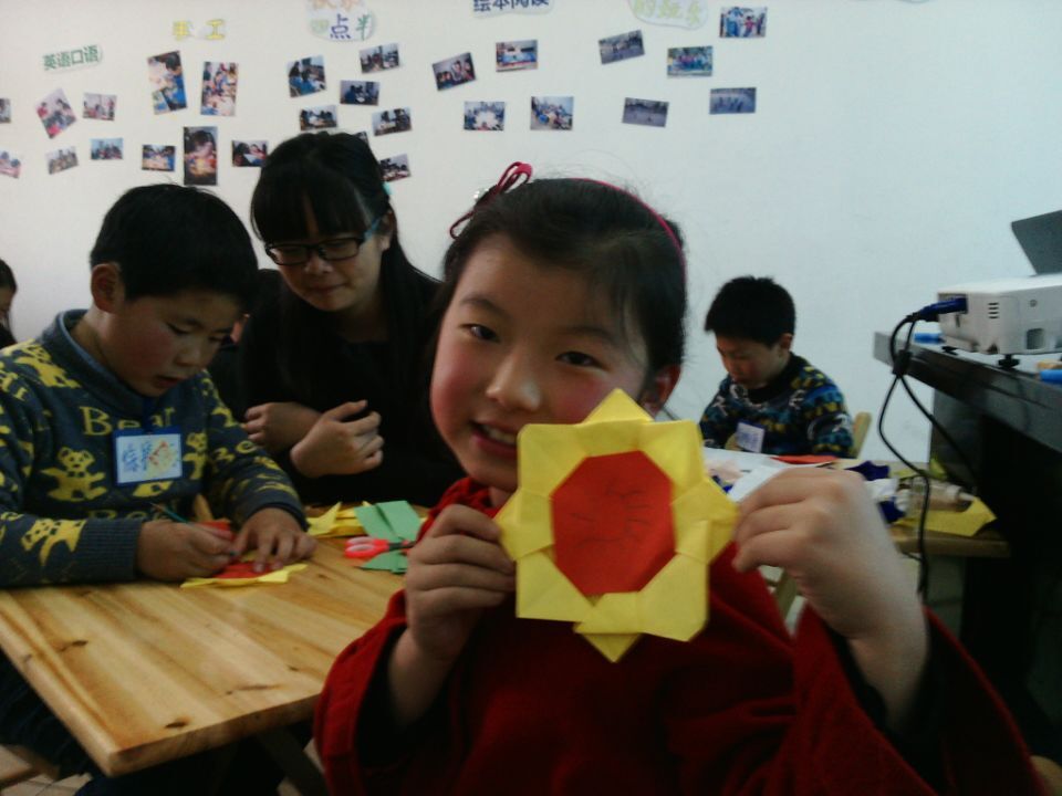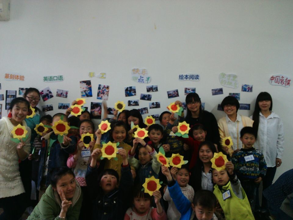 在最后一个备受期待的环节中,王玥同学带领志愿者和小朋友们一起学做太阳花。志愿者和小朋友们一样也都是第一次做太阳花,心灵手巧的小朋友们往往比我们的志愿者姐姐学得更快呢!每每完成一个步骤,小朋友们都会高举手中的作品向姐姐们示意:老师!你看!我都做好了,下一步呢?
