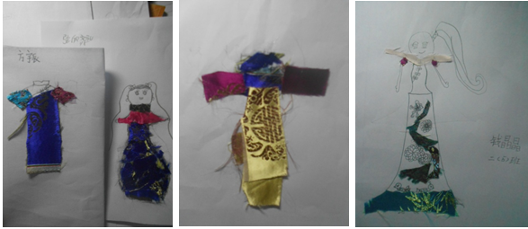 Duang ~~一大波旗袍设计巨作向我们来袭!在接下来的环节中,志愿者发下白纸、铅笔和橡皮等材料,让孩子们发挥自己的想象力画出心目中的旗袍,然后用挑选的废布料来完成旗袍的最终设计。在旗袍小组成员们带领下,小朋友们一拿到纸和笔,就齐刷刷地着手在白纸上设计旗袍。小朋友们的想象力无穷无尽,最