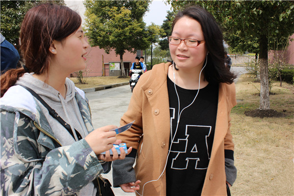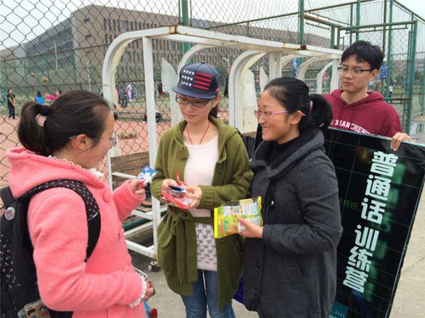 3月20日下午,在西操场,一场游戏竞赛形式的宣传开始了。“Duang~ Duang~ Duang~当我第一次知道要考普通话的时候,其实我是拒绝的……”一曲创意改编的《我的普通话》作为背景音乐,工作人员们拿着写有绕口令的小卡片,请锻炼结束的学生结成一组,比一比谁在最短的时间内流利地念完绕口令。同学们被这样有趣的游戏方式吸引了过来,在比拼中发现了自己的薄弱项。