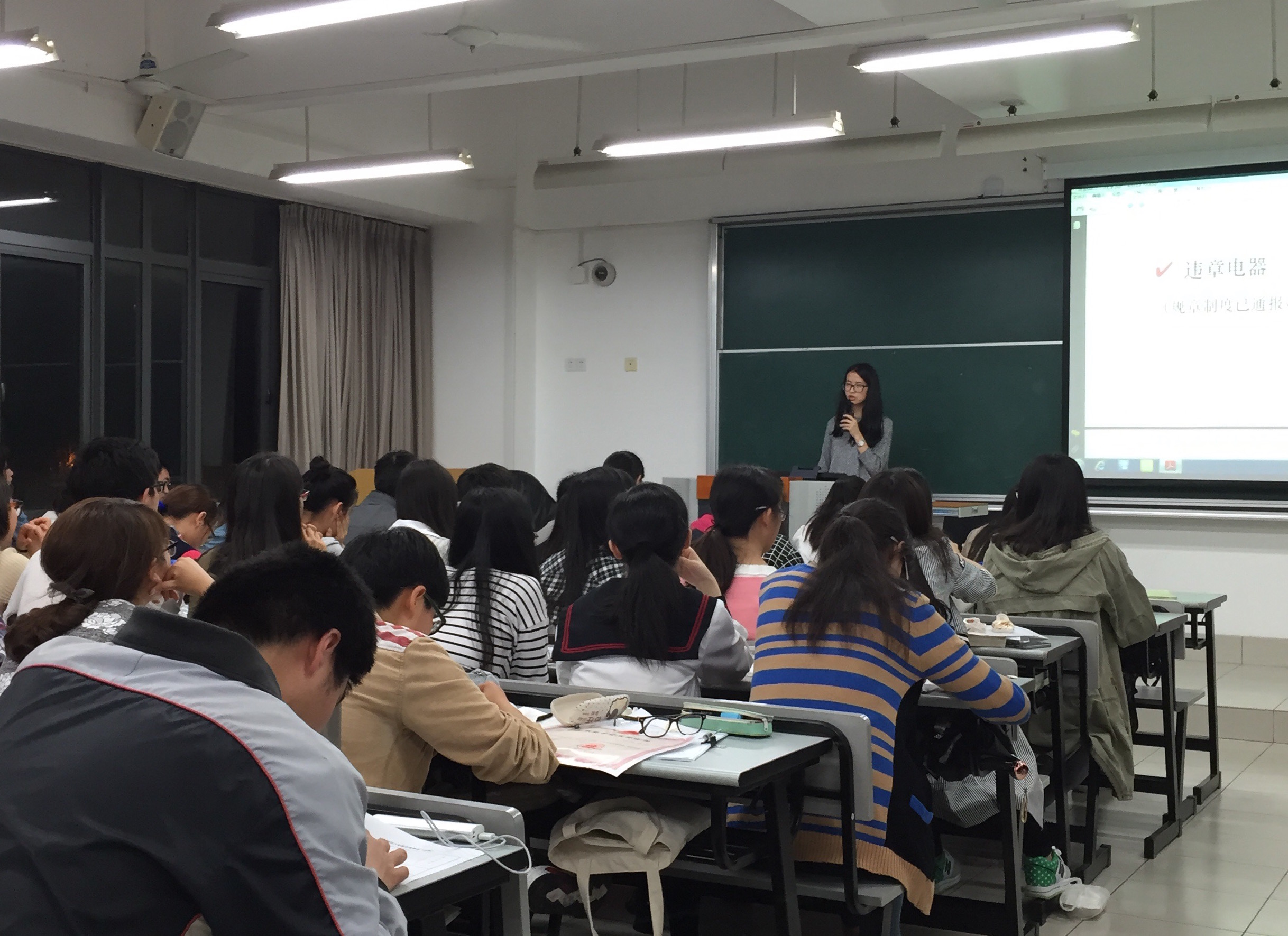 雷导在“宿舍安全”环节中,着重强调了违章电器的问题。在宿舍中不能使用电热毯、电磁炉、电饭煲、电吹风等电器,极易造成安全隐患,发生火灾等事故。同时,若宿舍卫生检查多次较差,对同学们的评奖、评优也会造成影响。雷导善意的警告让同学们对宿舍违章用电有了畏惧感与警惕性。