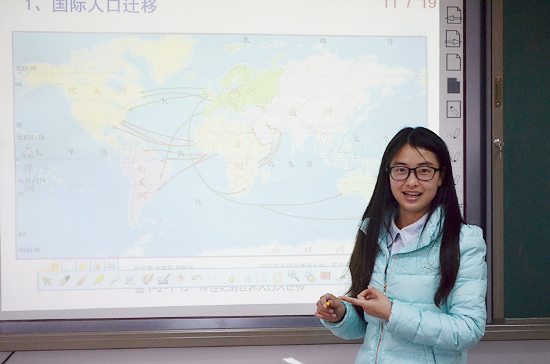 简腊梅“老师”向同学们展示“国际人口迁移图”