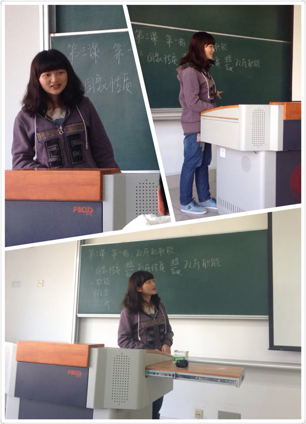 也许是新学期的第一次,前两位同学都有些紧张局促,但是后来一组的同学却是轻松得多了。第二组的彭鹏同学语气和缓,抑扬顿挫,善于用举例的方式厘清概念的含义。例如开始时,她用“出生前,爸爸妈妈要办结婚证,出生要办出生证”来说明人和政府息息相关的论点。她用针对台独势力,国家出台反分裂法以及她同学哥哥镇压贵州群众暴动事例说明国家的维持长治久安职责。她的讲课风格如春风拂面,在她缓缓又略带喜感的语气中,我们结束了政府管理与服务的职能的学习。