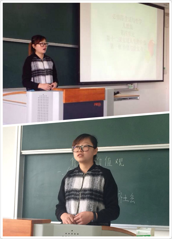 随后上台的是同样第一组的孟繁雪同学,较之李晨严谨的教学风格,她更显生动活泼。首先,她以保尔柯察金的《人的一生应该怎样度过》引出人的价值的概念。再次,她先简要解释了什么是价值,用具体事物的图片引出价值的意义,以物的价值类比人的价值,得出人与物价值之间的区别。为了使讲解生动形象,她举出了感动中国人物肖卿福献身麻风病人的例子,论证了对人的价值的评价标准,主要看的的贡献,精神贡献、物质贡献的观点。在讲解价值观的导向作用知识点期间,她还询问了在场同学的职业取向,同学们踊跃回答,场面热烈。最后,她以人与自然的关系为例巩固了今天的知识。