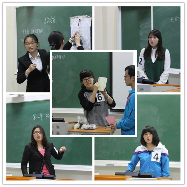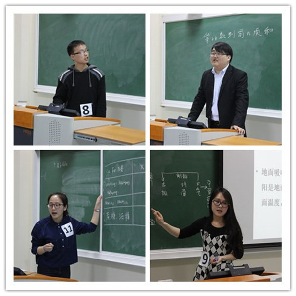 比赛一开始,物理专业的赵海西从大家较为熟悉的地理等高面知识作为引入,将物理学上较为抽象的等势面解释得浅显易懂,图文的结合、工整的板书让人耳目一新;地理专业的居贝妮关注时下热点——老龄化问题,通过新闻引入、视频介绍启发同学思考,现场气氛非常活跃;物理专业田均课堂设计严谨,各环节衔接紧密;体育教育专业的闫铭卓,课堂主题为运动与健康,结合生物学的知识讲解了关于体育锻炼的建议,幽默的语言让大家在轻松的课堂氛围中收获知识;生物专业的车莹,课题为细胞分化,根据影视剧抛出问题:“你是否是最初的你”来介绍不同的动物细胞的形态与功能,颇有创意。