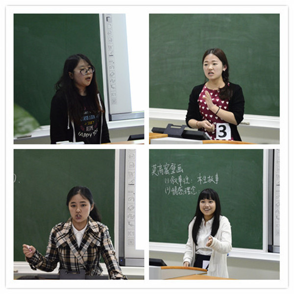 文科的选手发挥各自特长,带来同样精彩的课堂。来自英语专业的蒙根同学,用图片实例解释辨析了can't be/may be/might be/must be的不同用法,让学生对“语法规则——现在正在发生动作的推测”有了更加直观的认识;随后思想政治教育专业金笛同学将清晰的板书和简洁大方的PPT珠联璧合,从三方面“是什么?为什么?怎么办?”向同学问阐述了“政府依法行政”;两位同学珠玉在前,历史专业“出身”的马兰也不甘示弱,向我们讲述了有趣的希腊神话传说,模拟了古代雅典时期人们的交流对话,讲解了西方人文主义思想的起源;美术专业的赵淑敏同学向我们展示了敦煌壁画中美丽卓绝的九色鹿,从地理、历史、宗教、文化、审美情趣等多个方面引领我们感受到古代壁画艺术的魅力;