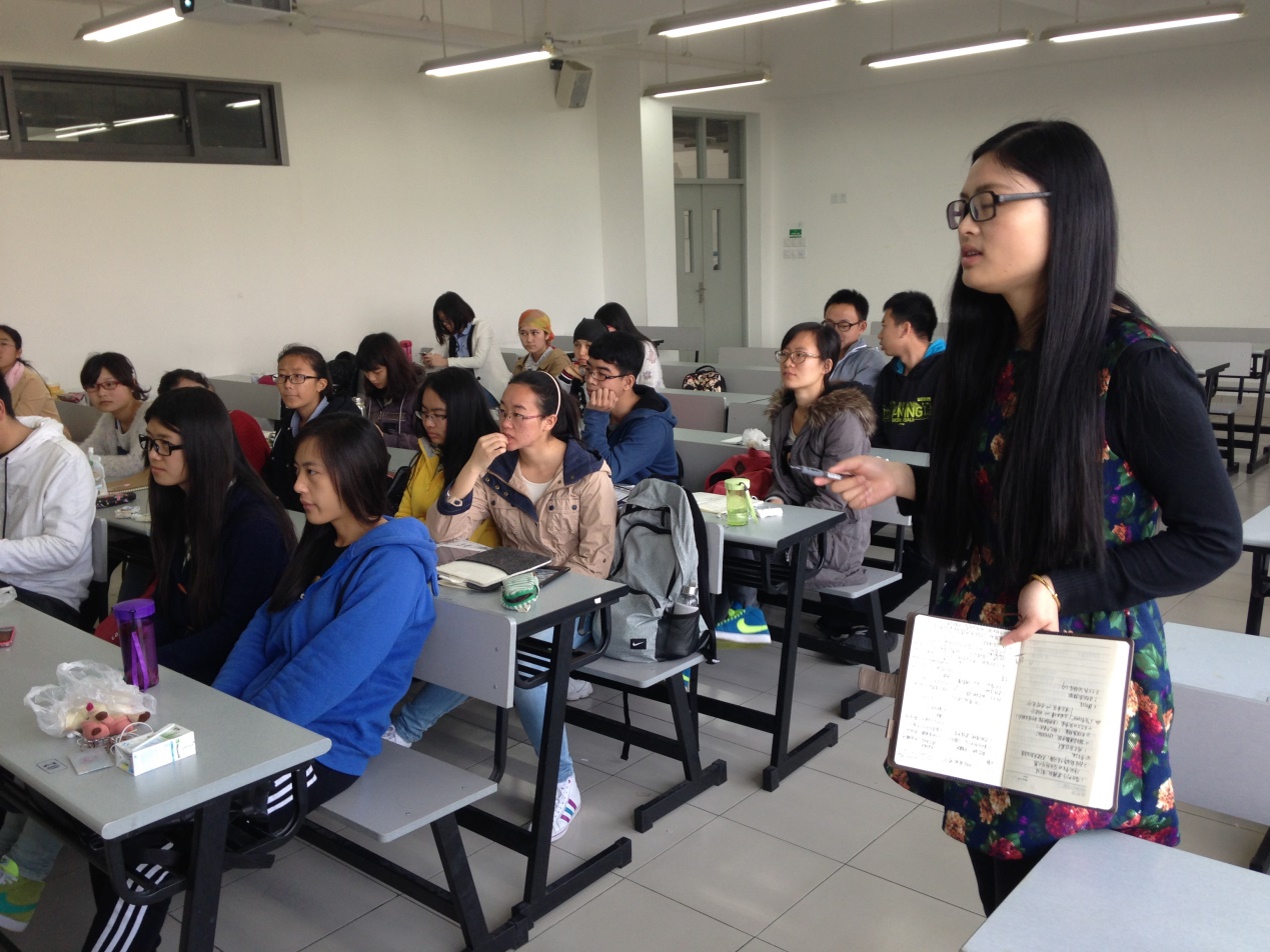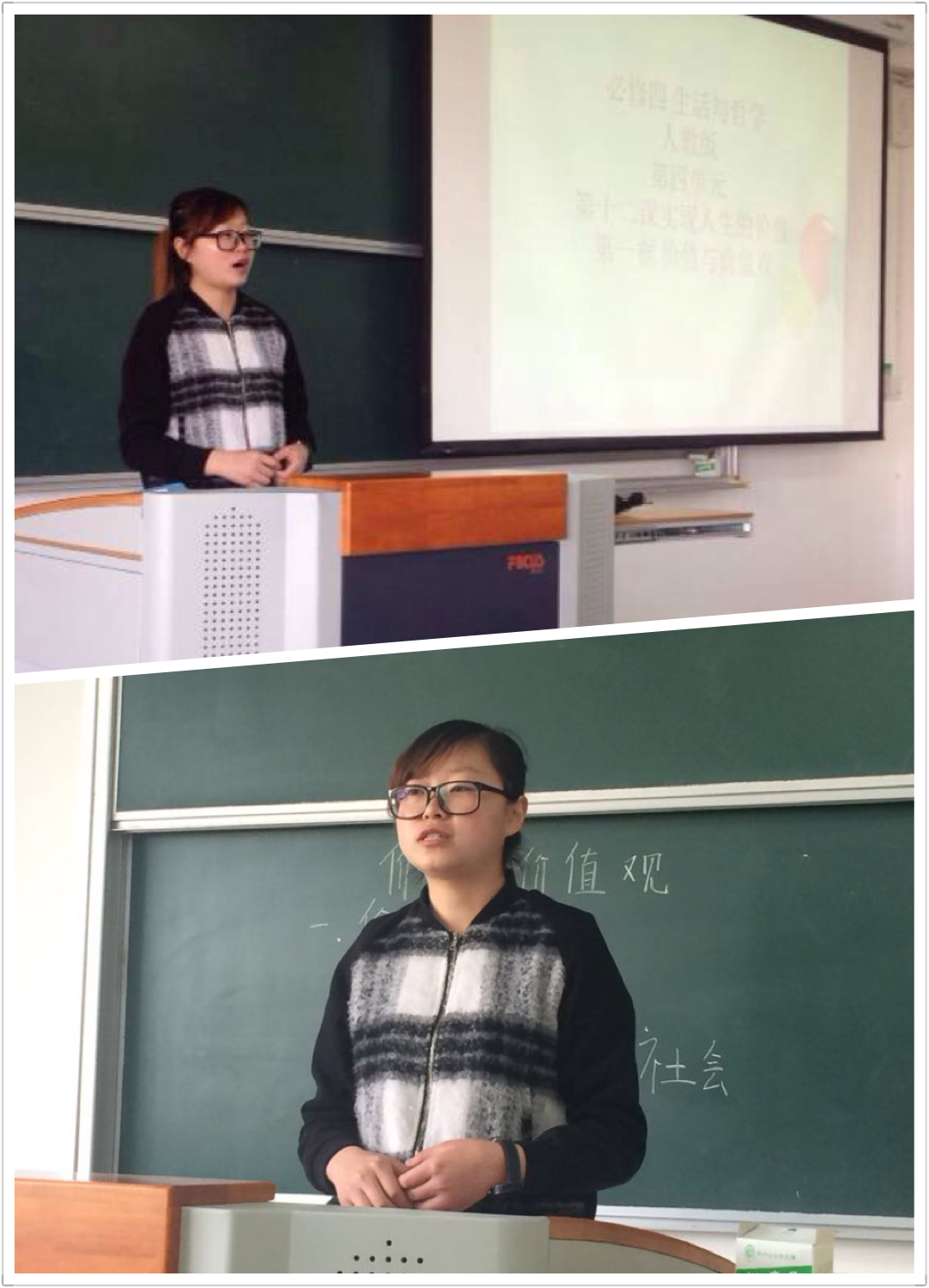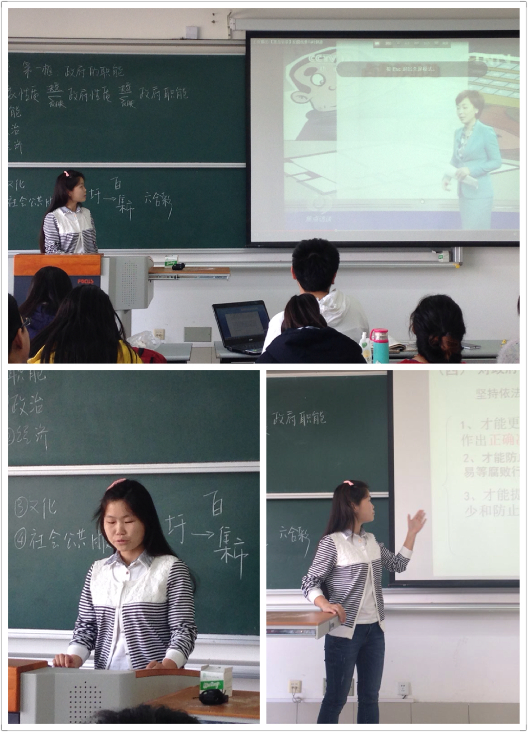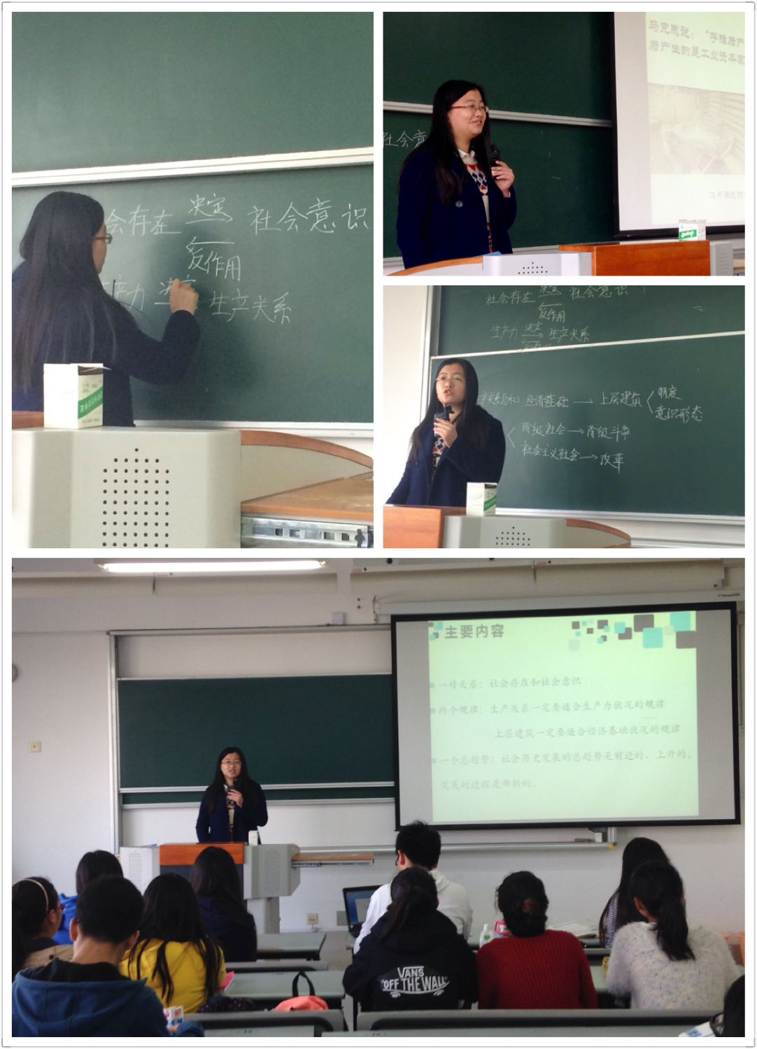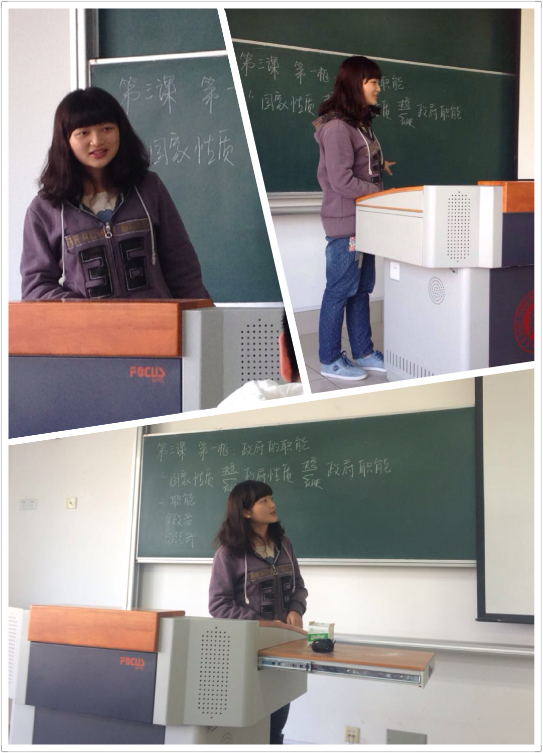 阳春四月,柳絮飘飞,芳草鲜美,落英缤纷,不知不觉中春天的气息已经融进校园里角角落落。作为开展了一年有余的系列活动,思政讲坛也将翻开新学期的新的篇章。 2015年4月15日上午八时,13级思政专业在二教210教室举办了本学期第一次思政讲坛活动。本次活动由第一、二小组为大家讲解高中经济生活、政治生活部分。 首先走上讲台的是第一小组的李晨同学,她今天给大家带来的是关于社会发展的知识点。甫一上台,她就为大家展示了两张图片,分别是一个石磨和蒸汽磨,并附上马克思的一句话:“手推磨产生的是封建主的社会,蒸汽磨产生的是工业资本家的社会。”以此导入了社会存在决定社会意识的知识点,为课程打下了坚实的基础。 随后上台的是同样第一组的孟繁雪同学,较之李晨严谨的教学风格,她更显生动活泼。首先,她以保尔柯察金的《人的一生应该怎样度过》引出人的价值的概念。再次,她先简要解释了什么是价值,用具体事物的图片引出价值的意义,以物的价值类比人的价值,得出人与物价值之间的区别。为了使讲解生动形象,她举出了感动中国人物肖卿福献身麻风病人的例子,论证了对人的价值的评价标准,主要看的的贡献,精神贡献、物质贡献的观点。在讲解价值观的导向作用知识点期间,她还询问了在场同学的职业取向,同学们踊跃回答,场面热烈。最后,她以人与自然的关系为例巩固了今天的知识。 在第一组结束讲课后,照例是同学与老师的点评环节。陈珍妮同学首先肯定了李晨严谨的逻辑和孟繁雪清晰的结构,但希望李晨能增加与同学的互动环节,孟繁雪能减慢PPT播放速度。辅导员刘佳老师同样也表扬了两位同学清晰的知识结构和优雅的教态,但对双方的互动环节提出了改进的建议,不仅应该增加交流,对于同学们所作的回答也要有所点评。另外,也希望双方从语言到例子上也能更生活化、更友好一点。对于师生的意见,两位同学表示虚心接受,再接再厉。 也许是新学期的第一次,前两位同学都有些紧张局促,但是后来一组的同学却是轻松得多了。第二组的彭鹏同学语气和缓,抑扬顿挫,善于用举例的方式厘清概念的含义。例如开始时,她用“出生前,爸爸妈妈要办结婚证,出生要办出生证”来说明人和政府息息相关的论点。她用针对台独势力,国家出台反分裂法以及她同学哥哥镇压贵州群众暴动事例说明国家的维持长治久安职责。她的讲课风格如春风拂面,在她缓缓又略带喜感的语气中,我们结束了政府管理与服务的职能的学习。 相对喜欢举例的彭鹏同学,同组的秦静静同学更喜欢用案例说事。她的讲课内容是对政府监督的知识点,所以一开始她就为大家播放了滥用职权的“吴局长”的新闻视频。在随后的讲解中,她将“吴局长”贯穿其中,作为实行政府监督的反面教材,加强了枯燥知识讲解的趣味性和课堂的连续性。 上午九点半,第一次的思政讲坛在团支书赵梦琳的主持下顺利结束了。在本次思政讲坛中,四位同学磨练了胆量,暴露了问题,在场的同学同样感同身受,也是受益匪浅,希望所有同学都能积极走上讲台,成为优秀人民教师。 文:郑培立