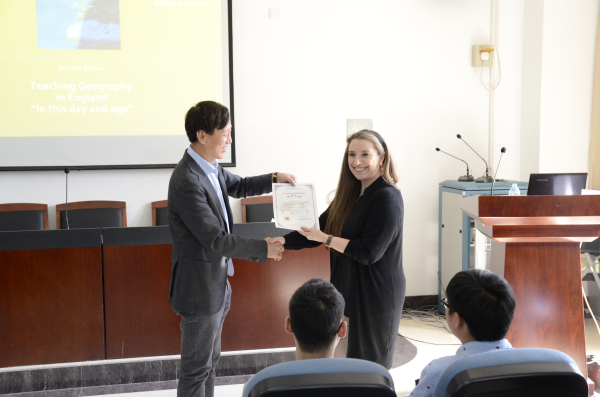 在热烈的掌声中,讲座开始了。Dr. Brooks从地理教育对青少年的的意义讲起,向我们介绍了英国自2014年起的地理教育改革以及英国过去的地理教育发展,并向我们展示她本人在地理教育方面的一些研究成果,让我们对地理教育有了新的认识。