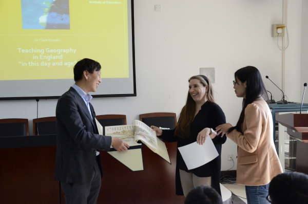 接下来是自由提问环节,同学们在Dr. Brooks精彩的演讲中获得了许多关于地理教育的新的思考,接二连三的提出了许多自己的疑问和想法,Dr. Brooks幽默又独到的回答赢得了阵阵掌声。 活动的最后,王军教授代表地科院发表讲话对Dr. Brooks致以感谢,并赠送礼物;段玉山教授向我们本科生同学表达了希望我们好好学习为地理教育的发展而努力的殷切期望。由英国地理教育学家Clare Brooks主讲的”Teaching Geography in England”讲座活动到此圆满结束。