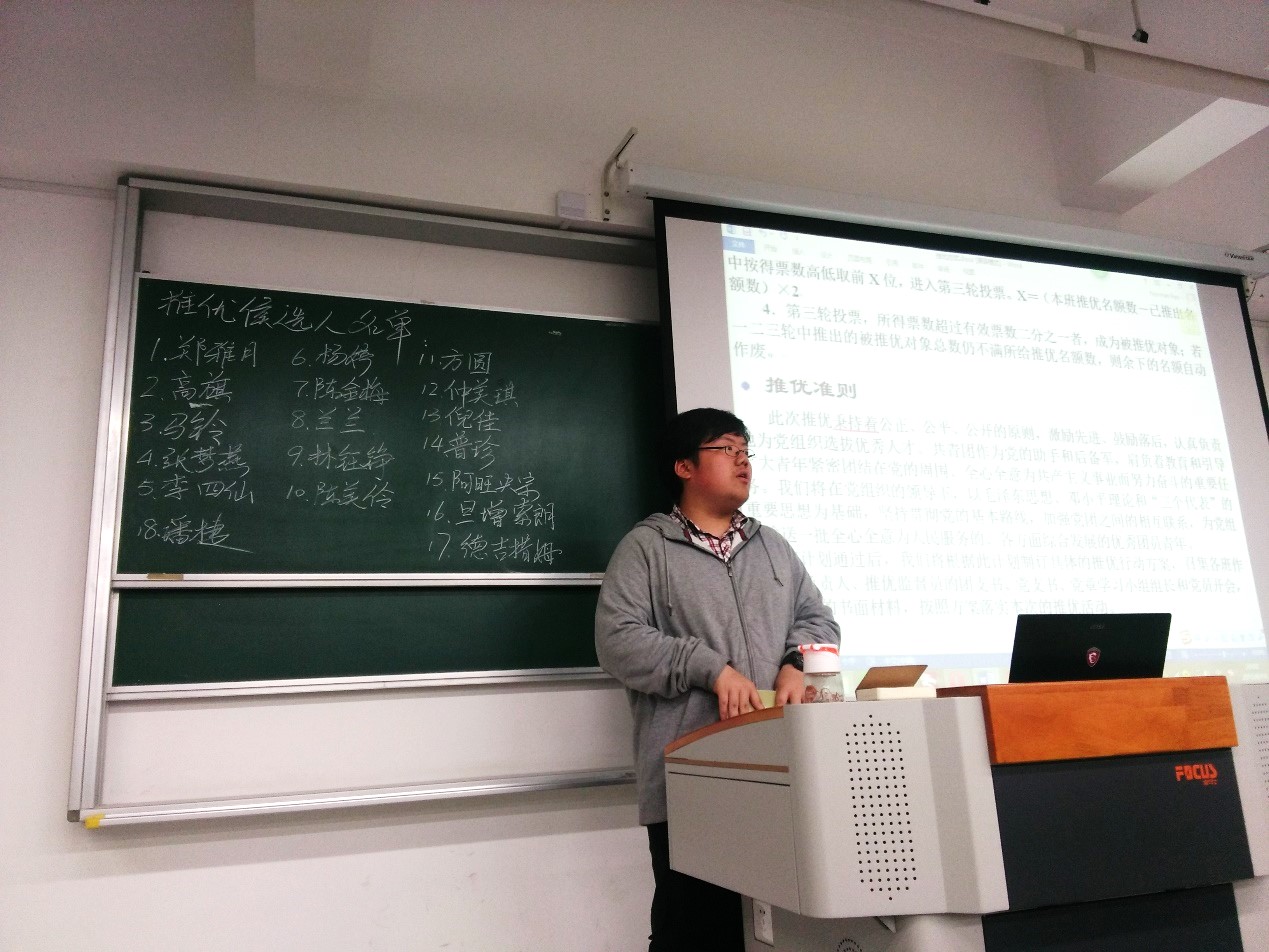 推优工作采用各班民主投票的方式来推选具有向党组织靠拢意向的优秀团员青年。在这过程中,秉持公正、公平、公开的原则,激励先进、鼓励后进,支部团员认真负责地为党组织选拔优秀人才。不在推优候选人之列的同学受邀作为监票、唱票、计票专员,严格依照推优规则,认真负责地将选票收齐、在支部全体团员监督下清点选票并开始唱票,计票。经过三轮庄重而有序的投票,支部团员先后选出了四名共青团员:潘捷、李四仙、陈金梅与普珍作为本学期我支部票选出的推优对象。这四名同学思想上要求上进,在支部中各显活力,积极参加团支部活动及班级活动,在过去一阶段给大家留下了良好的印象。