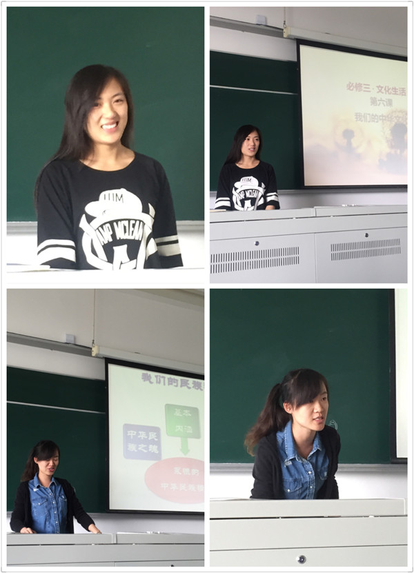 文化生活在高中政治中一向以难以把握著称,但是第四组的陈珍妮和尹越同学的课程展示既显示了清晰的思维,又非常地接地气。陈珍妮同学负责的是“我们的民族精神”一课,刚刚上场,她便询问大家是否看过今年春晚。因为春晚已经变成了议论的热点,所以珍妮的问题引起了同学们热烈的回应。但争议再多的春晚也是中华民族团结的象征,在嬉笑中,陈珍妮顺利带领大家进入课程内容。在课程里,陈珍妮善于利用时下热点,用“投降的叙利亚女孩”、“平凡的世界”和范冰冰的奋斗历程为类比,解释了团结和平、勇敢勤劳的中华民族精神。她的讲课语言诙谐,受到了同学们的五星好评。而负责“我们的中华文化”的尹越开始便在PPT上为大家展示了雄伟瑰丽的世界古代文明,看着这些文明遗迹,同学们啧啧称奇。但她突然话锋一转,反问这些文明现今如何?同学们还未回答,便又展示了古中华文明的精神、物质文化,不禁生出油然自豪之感。虽然在点评时,同学们认为尹越同学的教学重点需要明确,但对她以历史作为切入点的做法还是表示了认同。