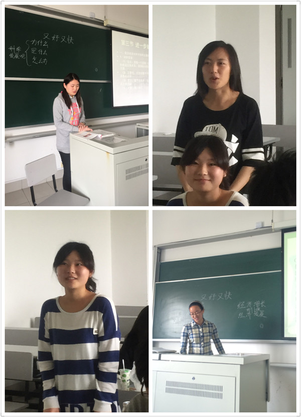 送别第四组美妙的文化之旅,第三组关于经济的讲课让台下同学深切认识到兴趣在课堂上的重要作用。作为“又好又快,科学发展”主讲人的袁楠然同学一开始就抛出了“你认为什么是小康”的问题,引起同学陷入深深地回忆。有幽默同学对答,天天能吃上土豆牛肉的日子就是小康生活。袁楠然微笑不答,点开一张雾霾图片,反问天天坐在雾霾里吃土豆牛肉是小康生活吗?大家笑了,这时候,大家是不在玩手机的。随之,袁楠然进入了科学发展观讲述时间。虽然据点评同学称,其思路清晰,逻辑清楚,但抽象的科学发展观的陈述,一条一条的罗列还是令人昏昏欲睡,这时候,大家没有不低头玩手机的。所幸随后张娉同学的“经济全球化与对外开放”的导入将大家又带回课堂,她的欧洲“空中客车”的生产过程真是精彩异常,英国的生产技艺,西班牙的机尾 法国的驾驶,德国的座椅让大家一下就明白现代的国际分工概念。这时候,有一半人抬起了头。