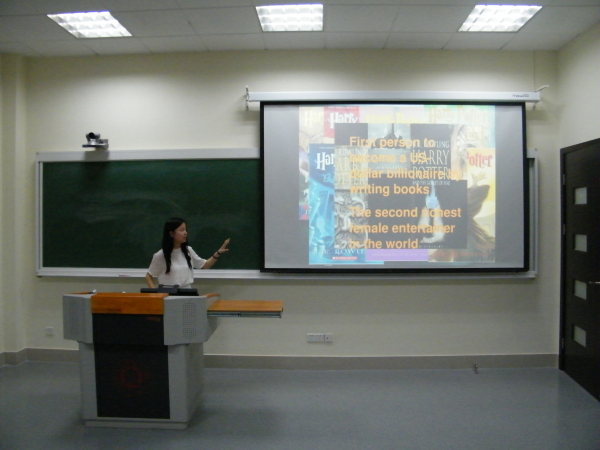 接下来,是唐梦芸同学以哈利波特为主线介绍了一些英国的人文地标。她颇具新意的从哈利波特的文学价值、作者成就、对英国的影响、演员中的老戏骨等方面进行介绍,更通过电影场景带大家浏览了英国的典型地标和美景。最后,她还简单介绍了英国的长寿剧—“神秘博士”,剧中天马行空,频频出现生物、物理等科学技术方面的知识。