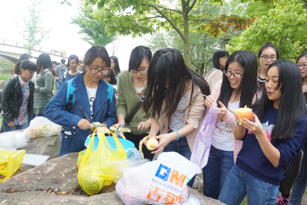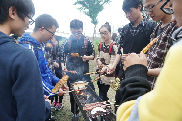 早到的同学主动地生火、搭烧烤炉,女生们做着水果沙拉。整个场面充满着欢声笑语。