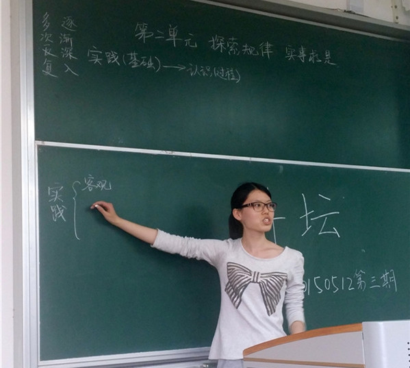 正所谓出师不利,第六组的武灵同学刚上台就遇到了一个严重的问题——原本准备的讲课PPT无法打开。正在大家手足无措之时,武灵同学却十分淡定地站出来说:“没关系,我可以直接板书讲课。这也是一次难得的考验机会嘛!”说着,她便“刷刷刷”在黑板上写下了这节课的主题:探索规律,实事求是。没有了高科技的辅助,时间仿佛又倒回了那个只有黑板与粉笔的年代,身材娇小的老师站在讲台上,掷地有声地讲述着寻求真知的过程,一个个娟秀却有力的粉笔字在黑板上清晰地展现了这节课完整的图画。台下的同学一个个都被这娇小的少女所爆发出的惊人力量所震撼,一个个都抬起头紧紧盯着黑板聆听着。