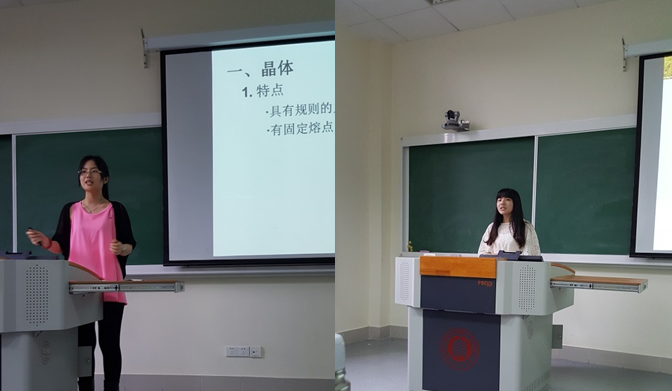 本周一,广西组的同学展示他们的讲课风采,丁老师作为指导老师。张顺义同学讲课的主题是物质的量浓度,张同学推陈出新从溶质的质量分数推出物质的量浓度,从本质上讲解了物质的量浓度出现的必要性及优点。老师评价这是一节非常有深度的课堂,同时建议我们在讲课的时候注意教态,身体不能太摇晃,手势眼神等都要到位。