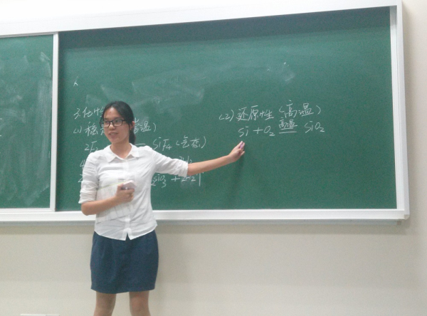 另外,龙云迷同学的引课很有特色,她从美国的硅谷引出硅,从物理性质、化学性质常规两方面介绍了硅单质,落落大方,讲述清晰,逻辑通顺。老师和同学们都觉得她很有老师的范儿。