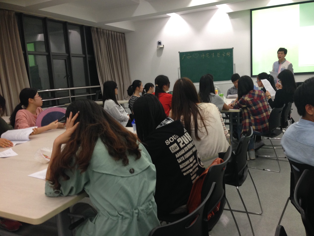 在交流会开始后,11级历史专业唐尧志学长进行了一些经验的分享,在分享中,提到保持好心态,注重细节。实习的过程中,上海的教育模式与广西有一定的差异性,在实习中尊重指导老师的安排,有些机会的安排可能并不适合你,保持心态面对指导老师的指导和安排。并且在求职过程中,要保持心态,不能让一场面试的结果影响下一场面试的状态。也特别说出了有关于面试的相关细节注意点,同学们都认真地记下笔记,这些分享也激起了同学们更多的求知欲望。