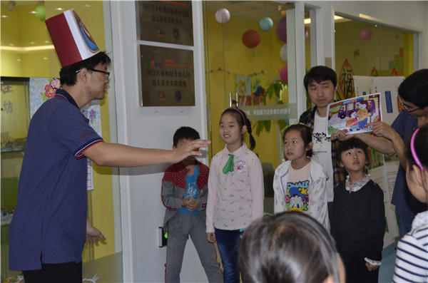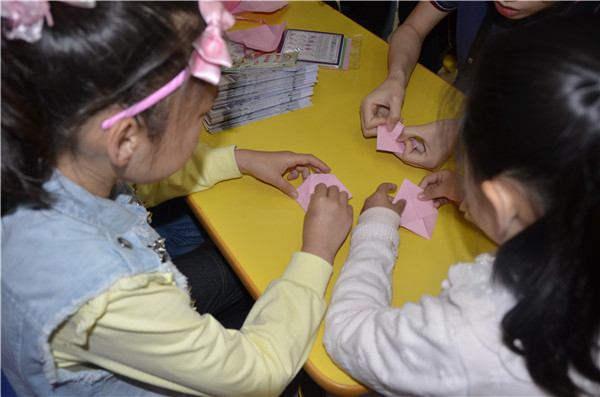 “相亲相爱一家人——亲子关系”组教小朋友们折纸,玩两人三脚游戏,吸引了许多小朋友和家长一起参与到游戏中。