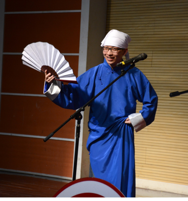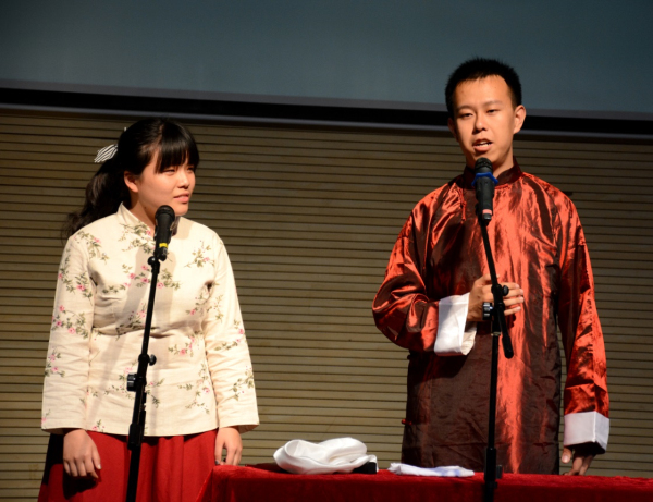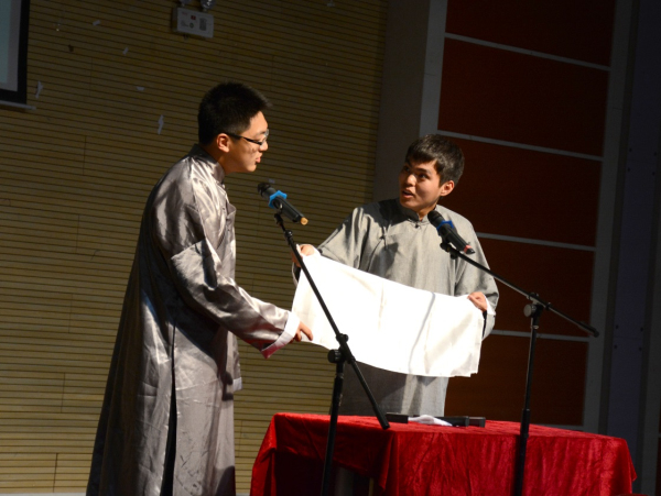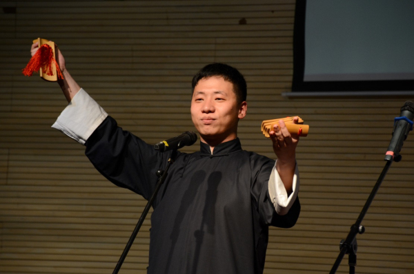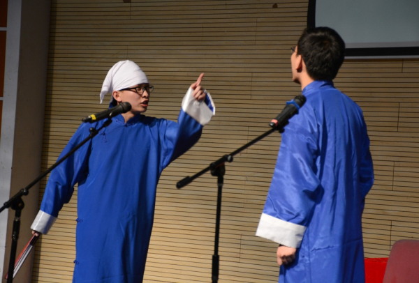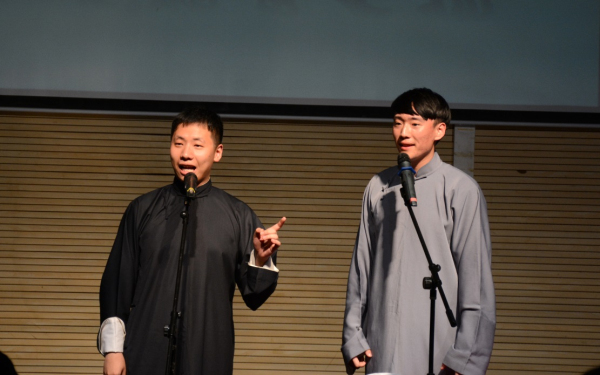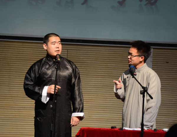 接下来上场的,是九乐堂堂主陆铭俊和华东政法大学的学生杨冠南带来的相声《同仁堂》。九乐堂是上海著名民间相声艺术团,堂主陆铭俊是上海高校相声联盟的指导老师,本次来到华师带来一段传统相声,是对本场极大的支持。《同仁堂》是一段有百年历史的传统相声,其中有非常长的关于药材的贯口,贯口是对每一位相声演员基本功的考验,陆堂主不仅精彩的完成了贯口,还在相声中间穿插了非常精彩的快板表演,让全场观众拍手叫好,纷纷拍照录像,杨冠南作为一个具有较丰富演出经验的演员,他的捧哏也是滴水不漏,这段相声将整个专场推向了第一个高潮。