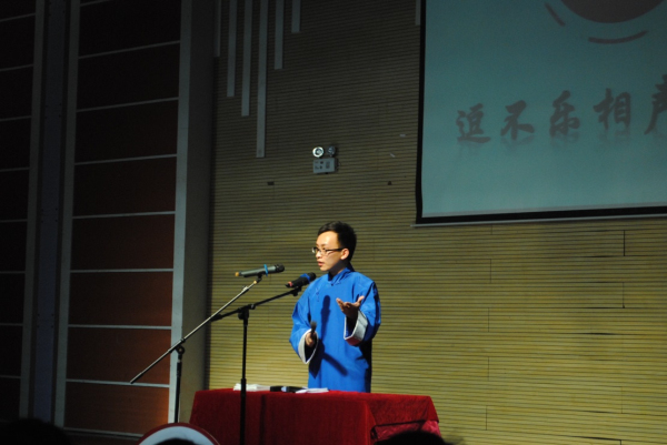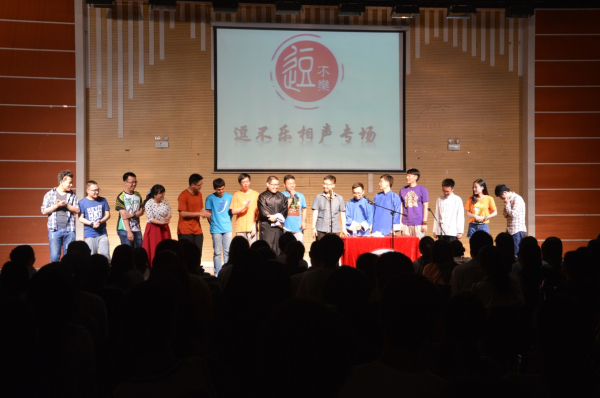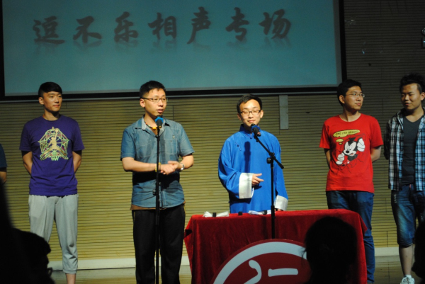 《同仁堂》之后登场的,是我们逗不乐自己的演员——潘大龙、张磊带来相声《学电台》,这段相声也是有着上百年历史的传统段子,潘大龙将它进行了改编。潘大龙是华师大中文系的博士,他执笔并表演的相声《文章会》在去年到四个大学进行了巡演。这段《学电台》依然保留了龙博士的鲜明特点,并且在相声中加入了京剧和呼麦,无论是观众还是后台演员,都对这段“酒瓶装新酒”的相声给予了非常热烈的反响和掌声。在专场之后,社团立马收到了华东政法大学的邀请,邀请《学电台》参演他们在6月9号举办的相声专场。