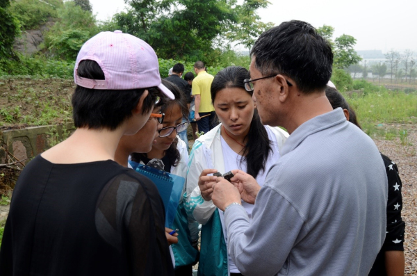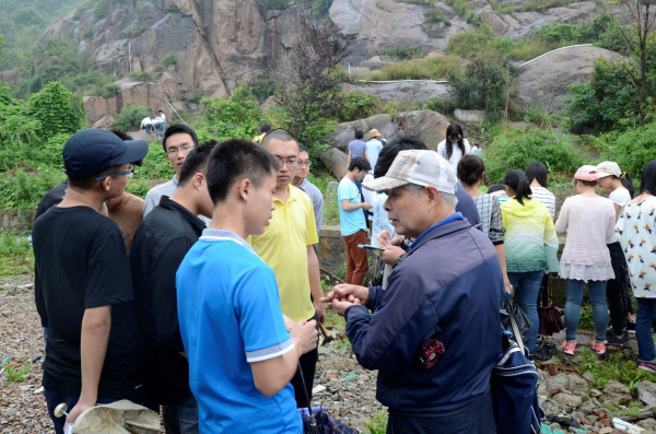 一行人首先来到了太湖西山大桥以北的穹窿山脚下。这里有一套层面界线十分清晰的上泥盆统五通组地层。在这里,我们要熟悉地质罗盘的使用和测量地层产状,包括测量地层的倾向、走向和倾角。在郑祥民教授和吕红华副教授耐心细致的讲解之后,我们便分组寻找良好的地层层面进行测量,尽管我们在地质学的课堂上已经学习过了地质罗盘的使用方法,但是到了实地进行测量的时候还是遇到了许多问题。在小组成员和老师的帮助下,我们渐渐掌握并熟悉了罗盘的使用方法,测量了该地层的产状。 同学尝试使用地质罗盘测量岩层产状 下午我们一同来到了天平山脚下。天平山山体是由整块深成侵入酸性花岗岩岩体构成的。因为是在地下深处侵入发育而成的岩石,因此矿物结晶良好、充分,形成全晶质的结构,也偶见捕虏体。天平山表面有着层层道道的沟痕,那不是岩层的层面,而是花岗岩体的刀砍状解理面。花岗岩沿着解理面被破碎、分化,因此我们也能见到非常典型的球状风化。在天平山,我们主要考察花岗岩的岩性特征,把握花岗岩发育条件与岩性间的关系,了解球状风化的形成机理。 老师点拨如何对岩石岩性进行分析 野外实习的第一天,从上海到苏州,持续地下着暴雨。但是我们的热情没有被雨水浇灭,我们就好像入魔一般沉浸在大自然的神奇景观之中。实习才刚刚开始…… 文:潘捷