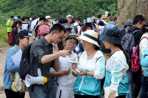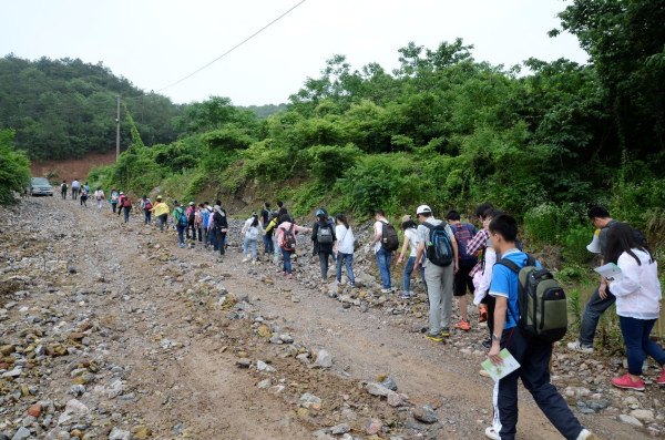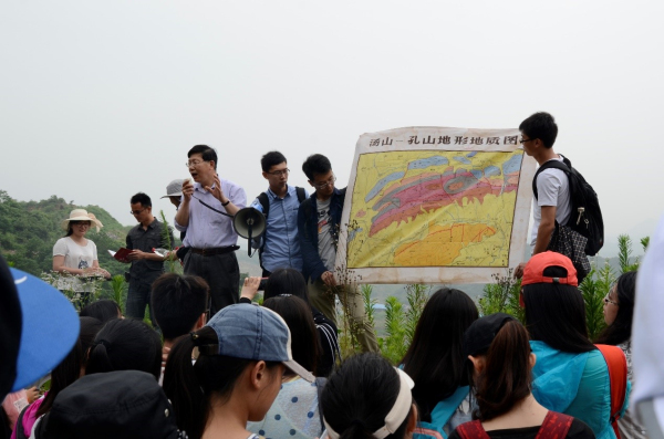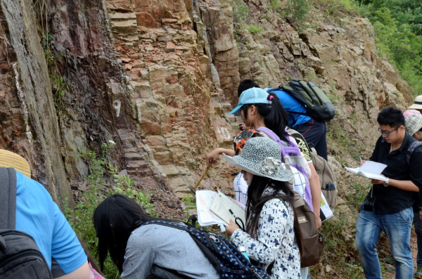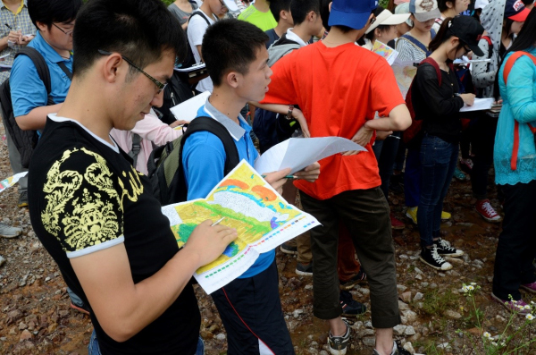 老师首先向我们介绍了地质野外记录本的记录要求,要求我们将日期、天气、位置都做好详细的记录,因为不同的位置、天气观察得到的结果大不相同。随后,老师便重点强调了今天实习的观察重点:最基础的就是要弄清我们今天考察的孔山北坡的地质环境,这里地处汤--仑复背斜的北翼,因此往镇江方向地层逐渐变新,孔山处又形成了一个小隆起,即在大背斜当中又有了一个小背斜。 郑老师还给我们布置了一个思考题,贯穿在今天的实习中留待解决:为什么孔山北坡和排山、棒锤山之间会形成地势低缓平坦的平原地区呢?这与其中的水系有什么关联?如何理解这种地形地貌形成的必然性?以及在人类生存发展过程中人类是如何利用这种地形的优势的?因此,今天的实习就我们需要观察地层、测量地层的产状,再看地层之间的接触关系,观察找到的生物化石,并推演这一地区的构造过程和地层的发展历史。 首先我们来到了上泥盆统五通组上部的灰白色石英砂岩地层,据老师介绍,在整个苏南地区,上泥盆统五通组很厚,这就反映了在晚泥盆世这个地区的沉积速度、地壳下降的速度都很快,而沉积环境又相对稳定。在学习了通过地层产状推演地质历史的技巧之后,同学们便分组开始测量地层的产状,观察地层岩石的岩性。 老师讲解地层产状测量、岩性判读要点 在结束了对上泥盆统五通组上部地层的勘测之后,我们沿着山路又陆续见到了下石炭统金陵组、高骊山组地层。可惜的是由于暴雨的关系,这些地层大部都被泥石掩埋,出露情况不是很理想。但我们通过老师的指点和讲解,了解了从晚泥盆世到早石炭世这一时间段内当地海陆环境的变化,在这个时期,这里有着频繁的海侵和海退。 同学们勘测背斜核部南北两翼地层产状 在实习的过程中,我们有三个学习小组,小组内的成员积极地分工合作、相互讨论,才能在紧凑的实习过程中完成产状的测量、岩性的判断和地层的考察。也正是在相互合作相互促进的过程中,小组的成员,班级的同学间有了更广泛的互动,彼此间增进了情谊。良好的合作为实习的成功定下了良好的基调,我们期待着未来几天更加丰富的实习内容。 文:潘捷
