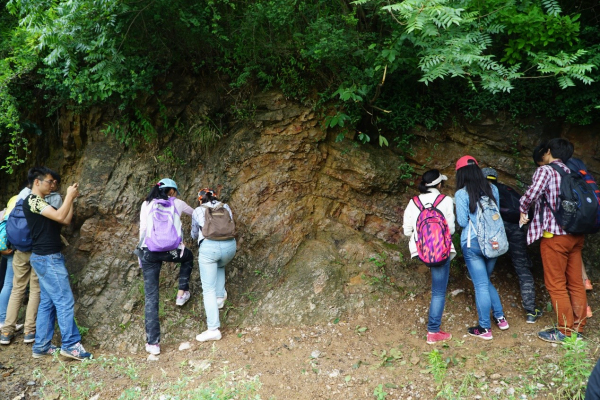 2015年6月3日,实习的第二天上午,我们的野外实习就在六朝古都南京开展。我们一早便出发前往南京孔山。由于昨天刚刚下了暴雨,今天又延续了阴雨连绵的天气,因此地上十分泥泞,一脚踩下去还能踩出水来。上山的路也变得艰难起来,但是这并未阻挡我们一探地质奥秘的决心,我们一鼓作气来到了高程约150米的陡崖前。