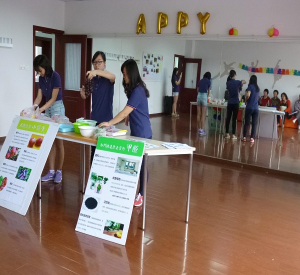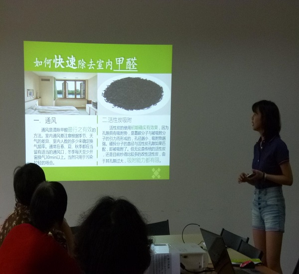 “果蔬农药”组的科普宣讲则主要分为两个部分:甲醛快速去除和清洗果蔬农药残留。首先,项目组成员向居民们介绍了快速去除室内甲醛的几种简单方法,分别包括通风,活性炭,放置合适的植物和温度湿度控制等,引起了居民们的响应并且也分享了自己的小方法。随后,大家转战场地,项目组成员先向大家讲解了不同果蔬的正确清洗方法,并解释了简单的原因。居民们不时提出自己的疑惑,成员们也都一一解答,热心解惑。最后,居民们被请上台亲身体验,也享受了自己劳动的成果。