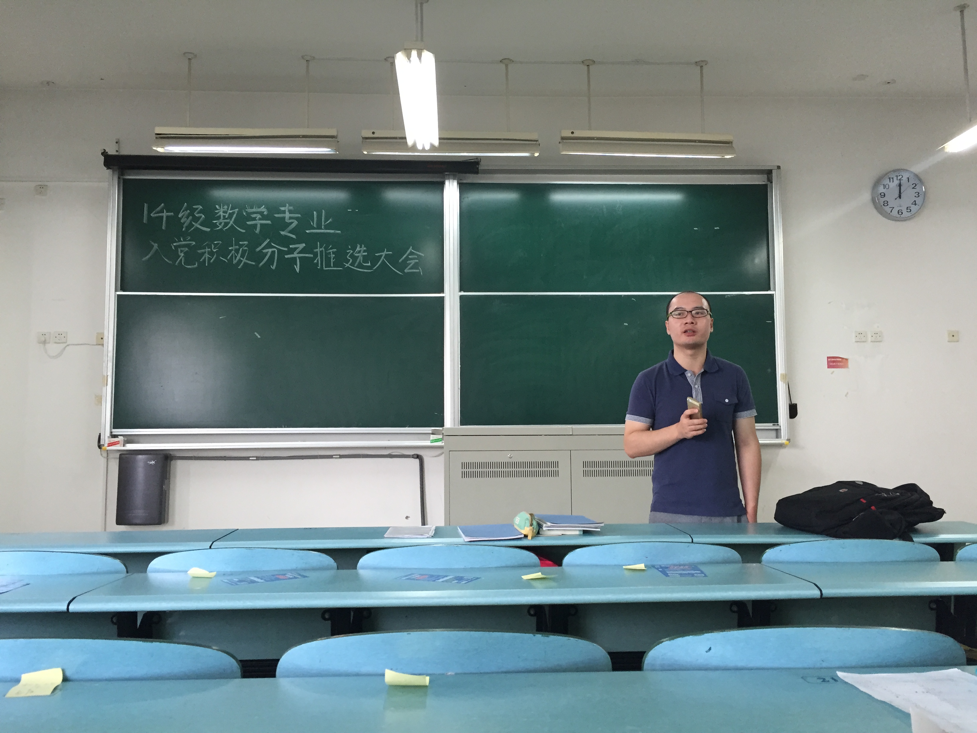 2015年6月19日,孟宪承书院数学与应用数学专业在3教302举行了入党积极分子推选大会,本次大会本着公平公开的原则,最终推选出三名入党积极分子。本次大会邀请了数学与应用数学专业的辅导员祝毅老师,他认真地为大家讲解选举要求以及对于党员的个人深刻认识。
