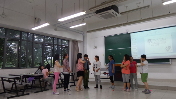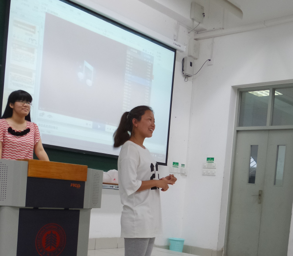 在班委简单的规则介绍后,游戏就开始了!在轻快的音乐声中,第一个游戏猜歌名已经把全场的气氛给炒热了,《当》、《七里香》一曲曲耳熟能详的歌曲响起,1组、2组的同学争先抢后地回答,并为大家献上了优美的歌声!