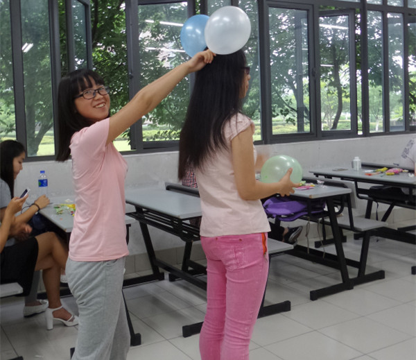 第二个游戏90秒接力更是把气氛推向了高潮,同学们这轮游戏可是被气球好好难为了一次,既要吹气球又要站在原地接气球,还得在最后把辛苦吹好的气球挤爆了。之后的踩气球、国王游戏、传吸管等游戏,台上的同学逗趣横生,台下的同学被逗得捧腹大笑。