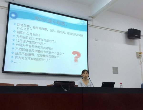 最后,老师与我们分享了一些教学案例,主要是教学设计案例。王老师通过展示并讲解关于台风、城市化的几个案例,具体说明了一种新的颠覆于传统逻辑教学的教学方式——基于问题解决的教学方式,主要以问题解决作为课堂的主导线索而展开课堂教学。这样的教学方式虽然对老师来说是一种挑战,但对学生而言,无疑是一种更加有效,更加契合的教学方式。