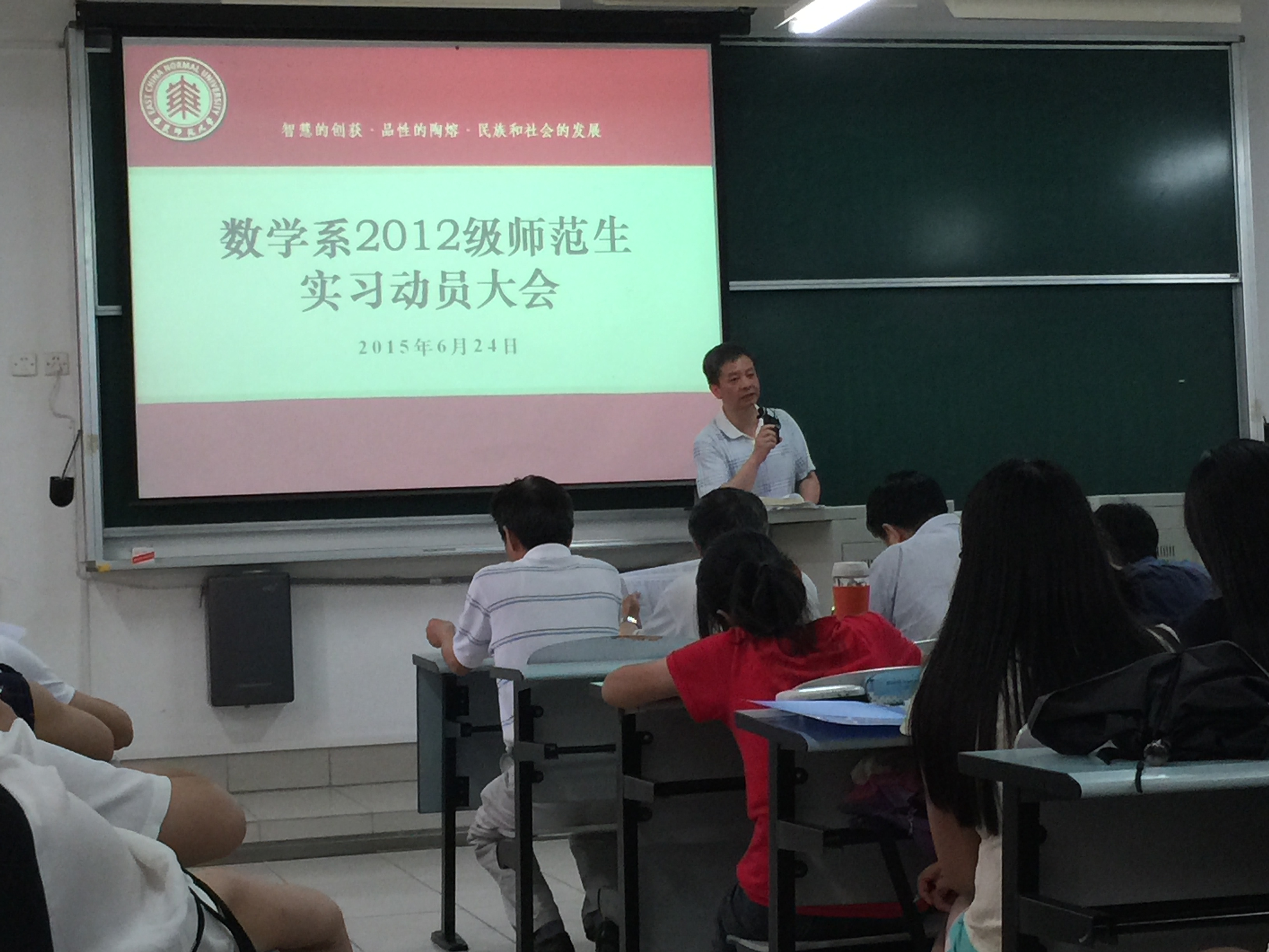 2015年6月24日下午,2012级数学专业师范生实习动员大会在第三教学楼202隆重召开。参加本次大会的有数学系副系主任温玉亮老师,指导教师万福永老师、龚妙昆老师、汪元培老师、刘攀老师、吴颖康老师以及团委书记邹佳晨老师,孟宪承书院12级数学专业辅导员祝毅老师。