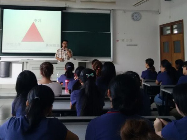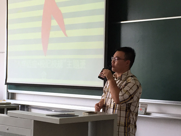 这堂班会课上是由助导袁涛学长主持。一个暖场小游戏扫除了午后的困倦,接着就开始了严肃认真的校规入学教育。首先强调要合理安排自己学习、组织工作和休闲娱乐的时间。在大学这个缤纷多彩的大舞台上,学习还是首要的任务,学习才是大学最重要的环节。毋庸置疑,大学仍然是学校,学校就是学习的地方。学习之中还有诚信的问题,诚信渗透在学习生活的每一个角落。同学们了解了作弊抄袭的处罚,了解了反面例子,对不诚信的行为说“NO”!