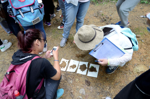 同学们在对土壤各层的物理及化学性状进行分析研究,并作好相关记录。