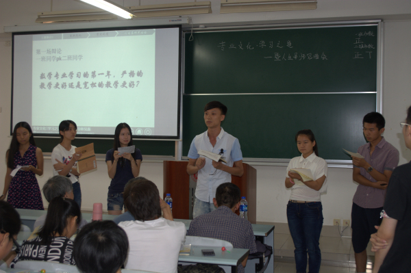聊完了学习问题,我们来个轻松一刻,15级一班和二班的六名同学们,吴昱廷、张文君、周晓雅、王志杰、林大伟和摆月秀来了次辩论赛:数学专业学习的第一年,严格的教学更好还是宽松的教学更好?同学们口若悬河,引得大家阵阵欢呼。