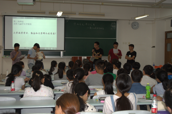 2015年9月11日上午,15级数学专业的全体同学迎来了第三次全体班会——专业文化•学习之道——暨人生导师见面会。在大学中,学习依然是我们生活的主旋律。如何适应在大学集体生活,如何在学习环境发生变化后仍保持好成绩,如何在学习和学生工作之间保持平衡等等问题是这次班会的热点。