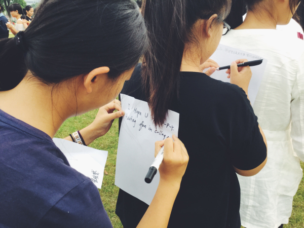 活动进入尾声,每位同学都领到一张彩色卡纸,当即互相帮助贴在背后,接着围成一个大圈,为前一位同学留下自己的祝愿以及美好的期许。顿时,草坪被温馨感动的气氛包裹起来。“希望未来能越来越好”“祝你能够实现自己的梦想”“提升自己,走向成功”……一句句简单却又真挚的祝福,融入了一种特别的浓浓的配料——家的温馨。