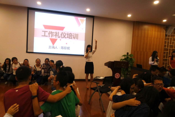 社区服务中心副主管陈珍妮学姐为小干事进行了礼仪培训。“珍妮说”的游戏再一次活跃了现场气氛,陈学姐教会大家向师长、同学发短信和email时的礼节,使大家受益良多。最后,学姐带领大家肩勾肩一起喊出了“我们是,孟院人”的口号,将气氛推向另一个高潮。