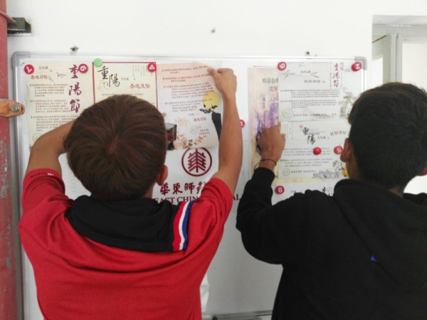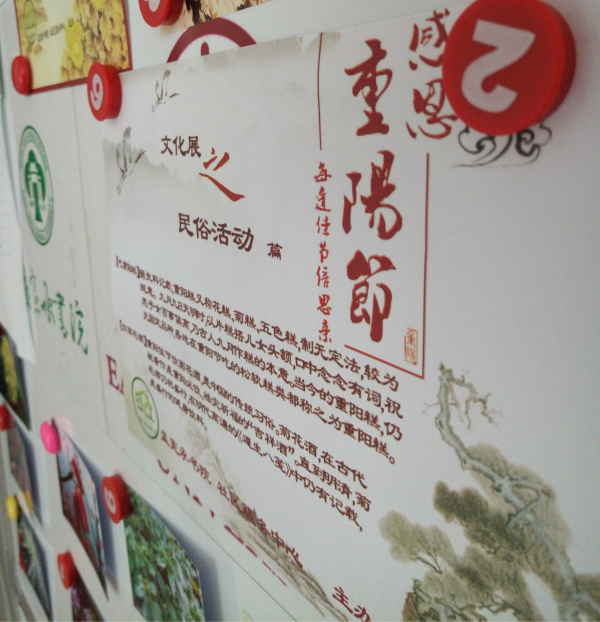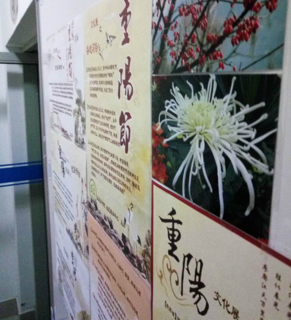 这一天,楼层公告板上焕然一新地全部换上了和重阳节有关的海报和照片。吸引了大量的学生驻足观看,这些展示也让同学们知道了重阳节从古代到当代的演变。在古代,重阳节不仅仅是王维关于“遥知兄弟登高处,遍插茱萸少一人”的诗歌,赏秋,饮菊花酒等也是重阳节的重要文化内容,并且不同的地区,有着各自的重阳文化特色。在目前我们的生活中,重阳节又蕴含了敬老的传统美德,很多人在这一天会特别关注偏远地区的孤寡老人以及留守儿童。