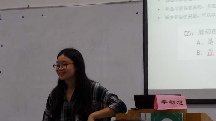 在轻松的氛围里,本次培训的主角也李初旭老师也登上讲台,开始向我们介绍问卷设计的基础知识。李老师首先让我们明确了进行问卷调查的目的以及问卷调查设计的基本准则即:利用尽可能少的文字获得尽可能多的信息。之后,李老师分别从调查问卷设计的基本方法、问卷设计前的准备工作、问卷结构和问卷设计的常见问题及注意事项三个方面向我们进行了讲解,中间还涉及到了许多问卷设计时的常用理论,如:里克特五段式量表。真可谓时面面俱到,应有尽有。在整个过程中,李老师也和同学们亲切互动,让同学们大胆说出自己的看法,使同学们在轻松愉快的氛围中GET到了许多极具实用性的新技能!