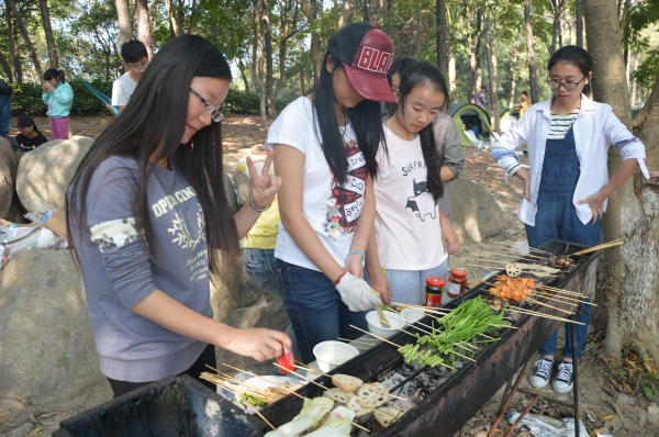 在滨江公园探查一番后,大家合议将烧烤地点定在一处树林阴翳、倚靠岩石的地方。副部长们带领着干事们前往另一处开阔地进行游戏,主管则带领部长们摆放好烧烤用具,开始准备美食。在工作中,主管和部长们展现出的都是干练的形象,力争协同干事们将社团发展中心推向更高峰,但是此刻,他们展现出了不同的一面:用竹签小心穿过纤细的金针菇,用小刀划开鸡翅以便更好地入味……认真的眼神依然,但又何尝不多了丝丝温情。烧烤时的阵阵热浪和烟气扑向他们,为了干事们享用美食时是满足,他们没有退却;加炭时铁钳上的热度令人浑身一颤,但是为了此次滨江之行的圆满,他们没有皱眉。