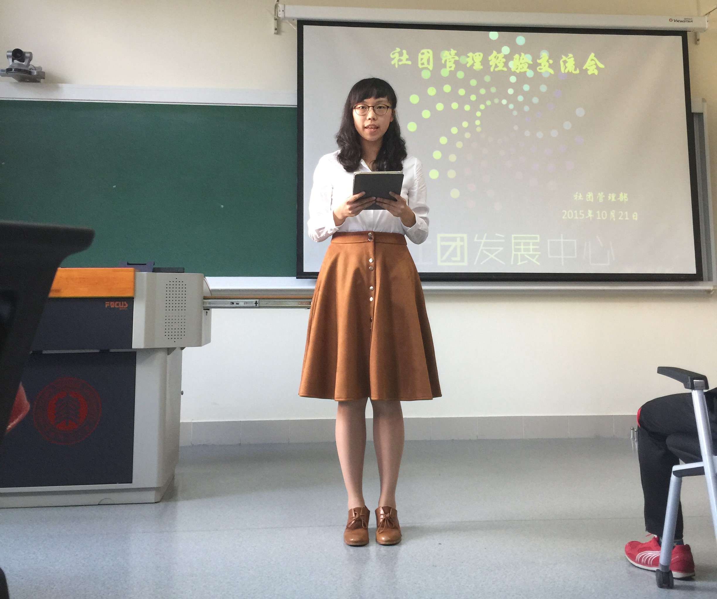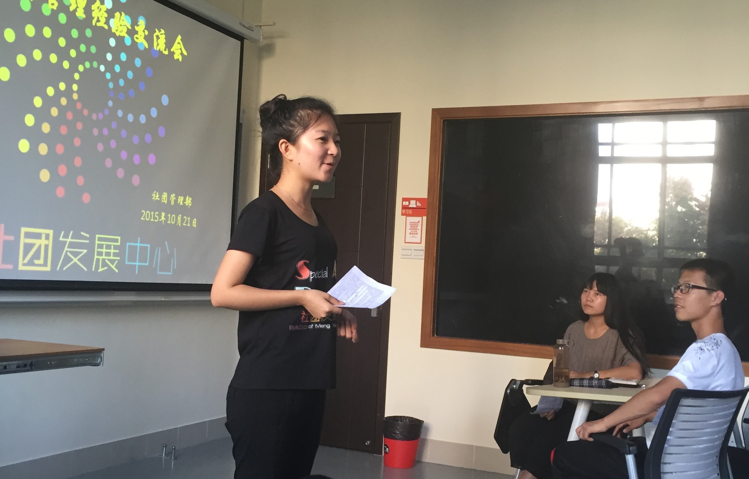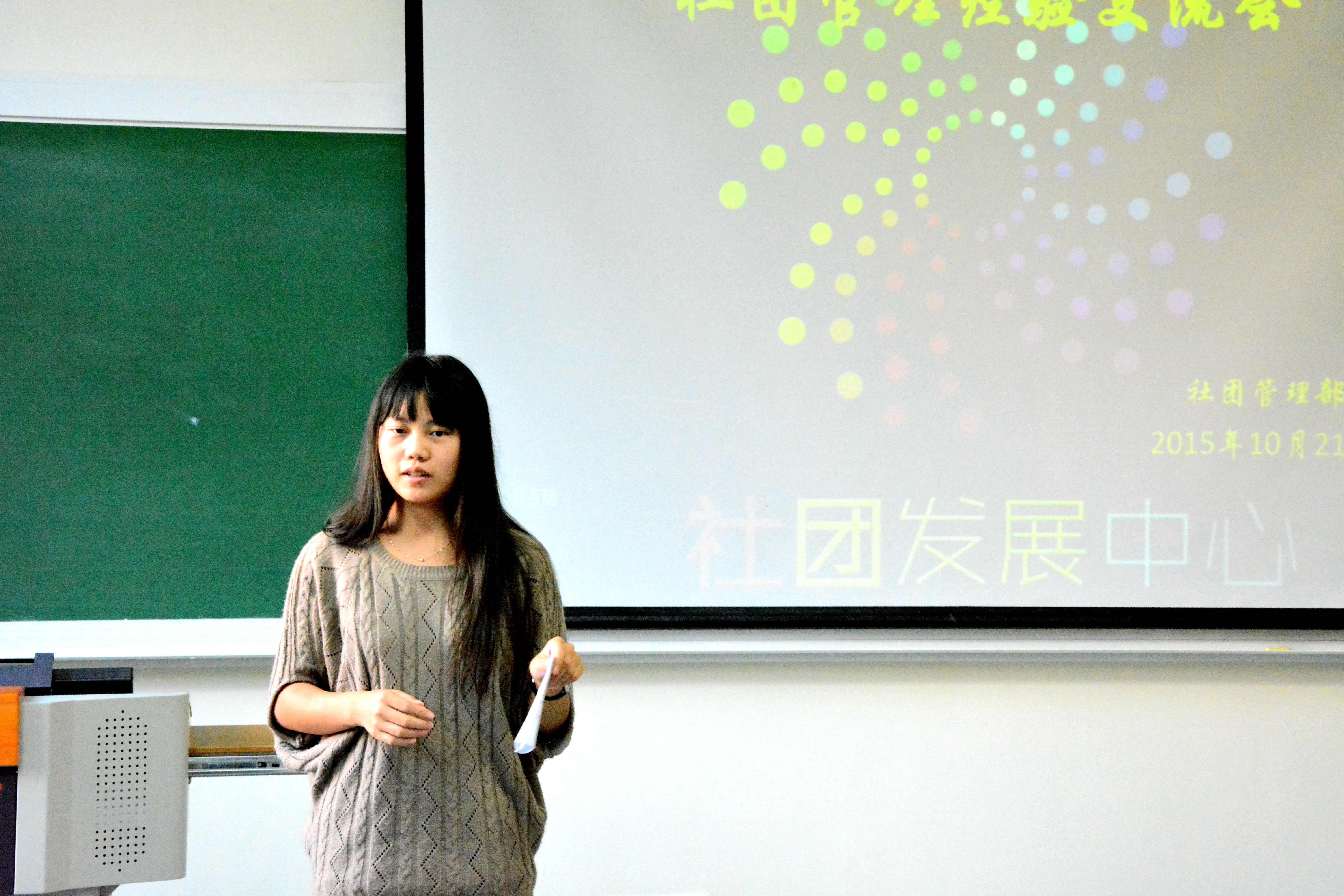 2015年10月21日15:00,由社团发展中心社团管理部主办的社团经验分享交流会在共享空间208举行。本次交流会旨在更好地促进孟宪承书院社团的发展,帮助有意向成立社团的同学了解社团成立流程,以及鼓励大家发展自己的兴趣爱好。出席本次经验交流会的嘉宾有逗不乐相声社社长代表石潇、铃兰旗袍小组前负责人张艳琳、群言堂社长叶喆、社团发展中心副主管丁晓敏。