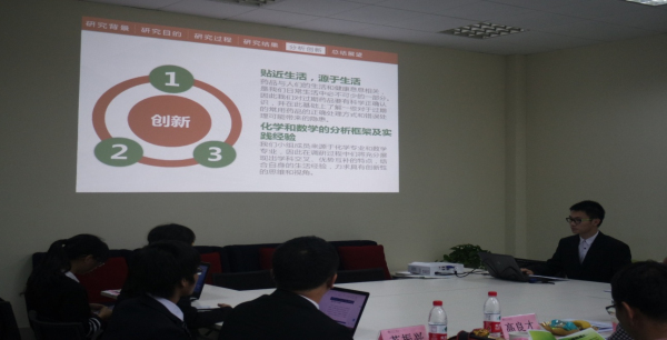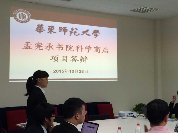 2015年10月28日下午,孟宪承书院共享空间220,科学商店组织的第一次项目答辩会拉开帷幕。我们荣幸地邀请到化学系资深老师陈波,物理系副教授宦强,学校科学商店总店指导老师、生科院高良才,孟院副院长苏振兴前来作为我们的评委团队。一系列的精心准备之后,我们正式开启了一段奇妙的答辩之旅。