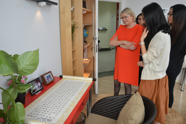10月22日,英国里丁大学就业中心主任Lorna来访。孟宪承书院学工组长、生涯发展中心指导老师陆敏、就业推进办公室副主任雷妍陪同参观了20号社区孟空间,就书院概况、空间布置、学生使用与管理等方面进行了介绍。Lorna女士表示特别赞同书院倡导的学生自主管理理念,对学生布置的孟空间表示认可和喜爱。
